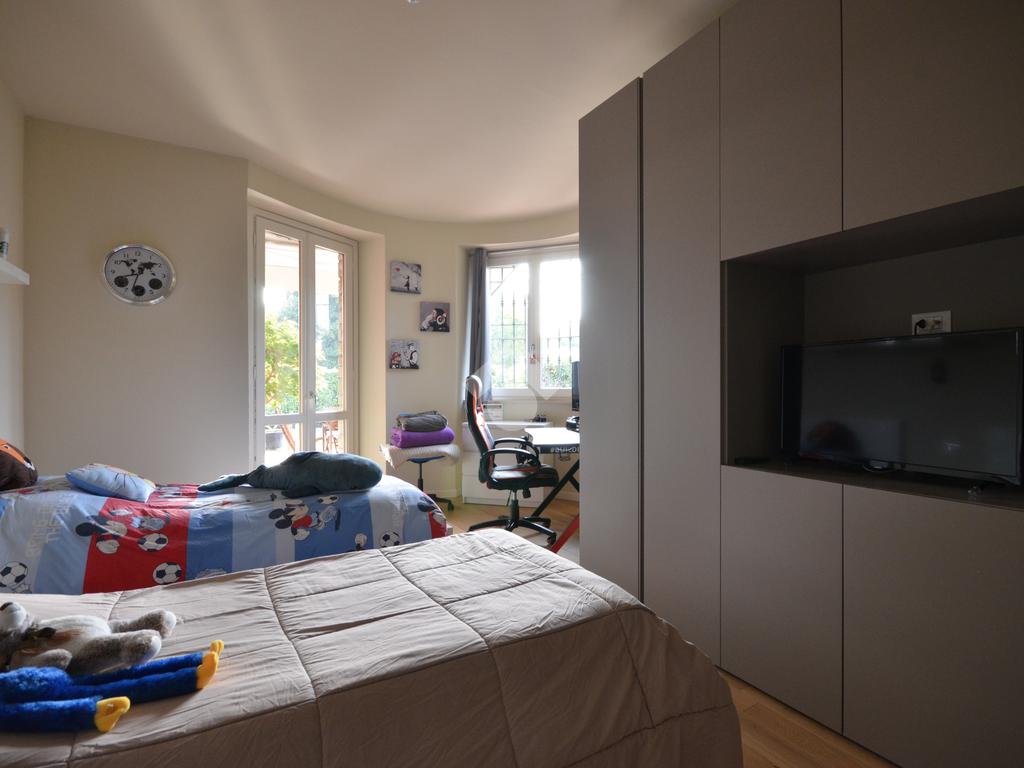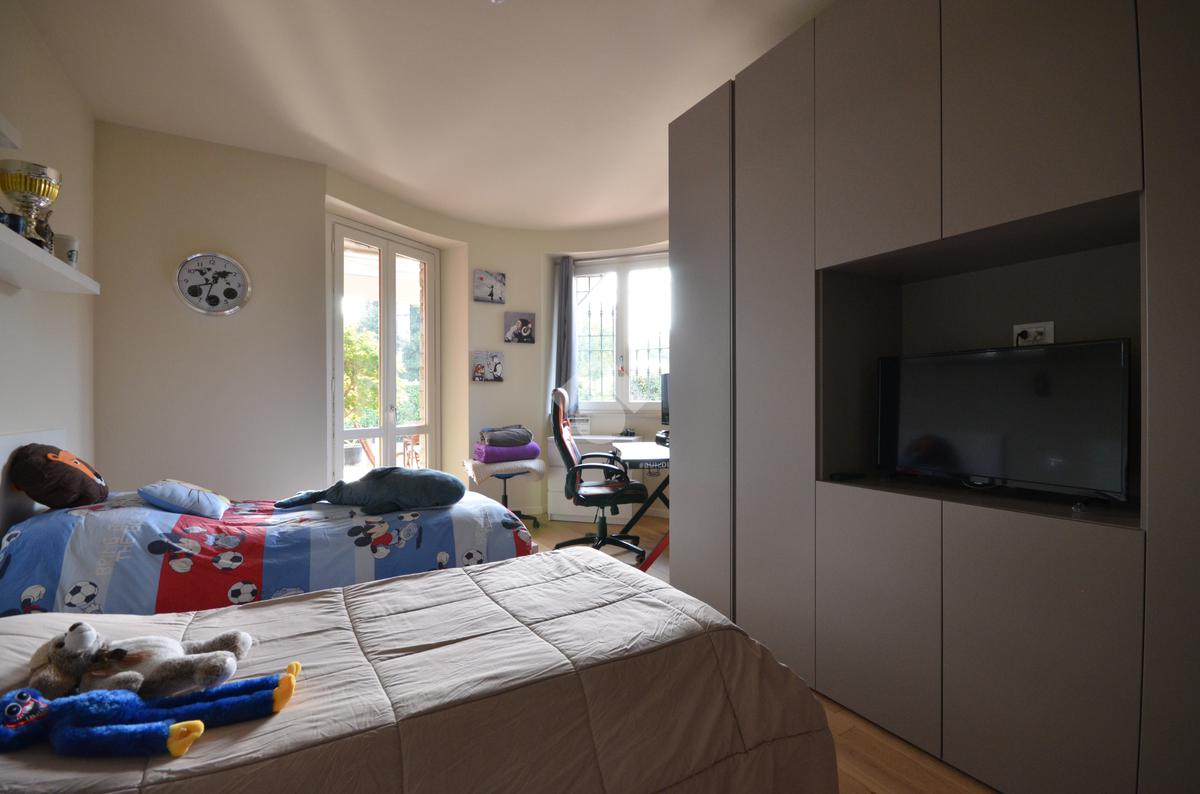 La zona notte, ben separata dalla zona giorno, è articolata in due aree: una camera matrimoniale con bagno privato e disimpegno e una camera singola e una doppia servite da un secondo bagno, utilizzabile anche come servizio per gli ospiti. Completa la proprietà una stanza dedicata a lavanderia.